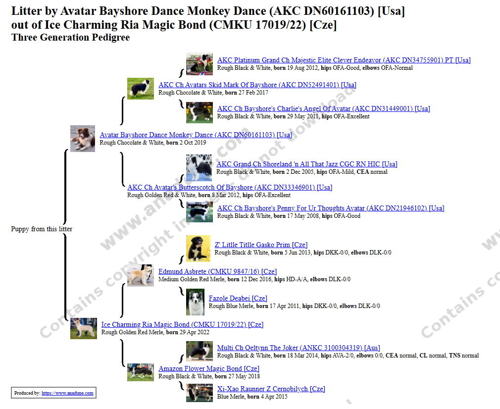 Začátkem ledna očekáváme štěňátka ze spojení Ice Charming Ria Magic Bond a Avatar Bayshore Dance Monkey Dance (březost potvrzena) |